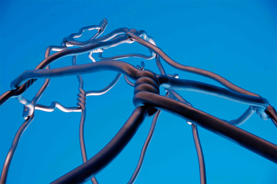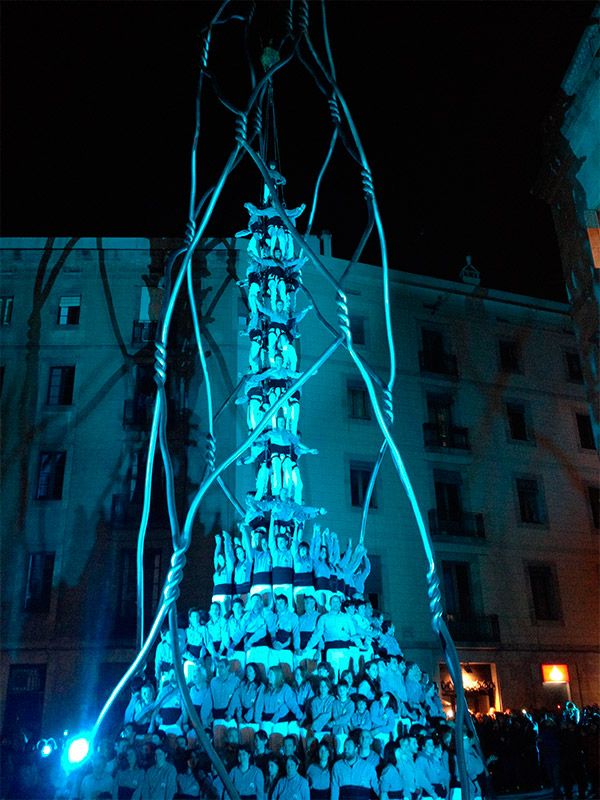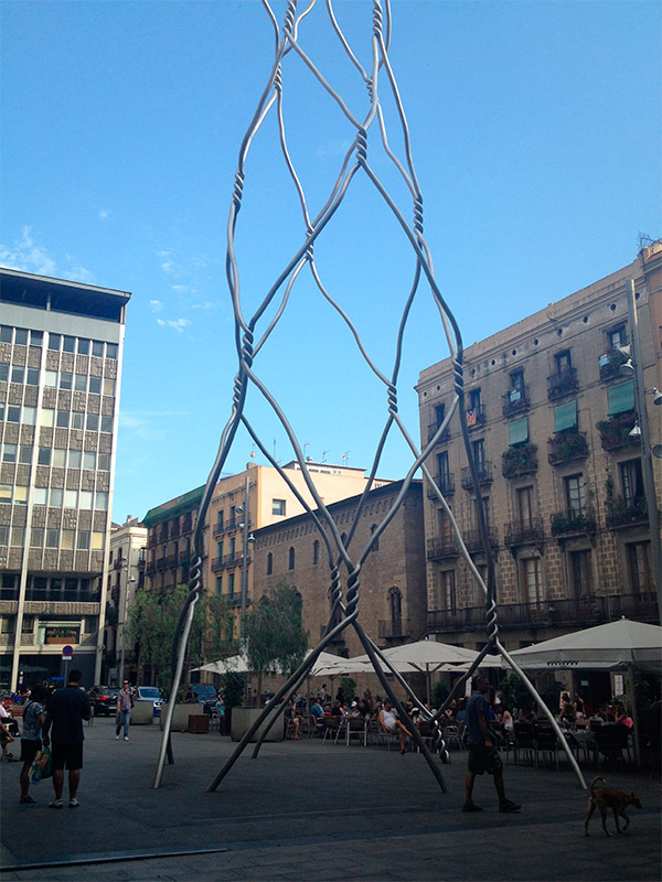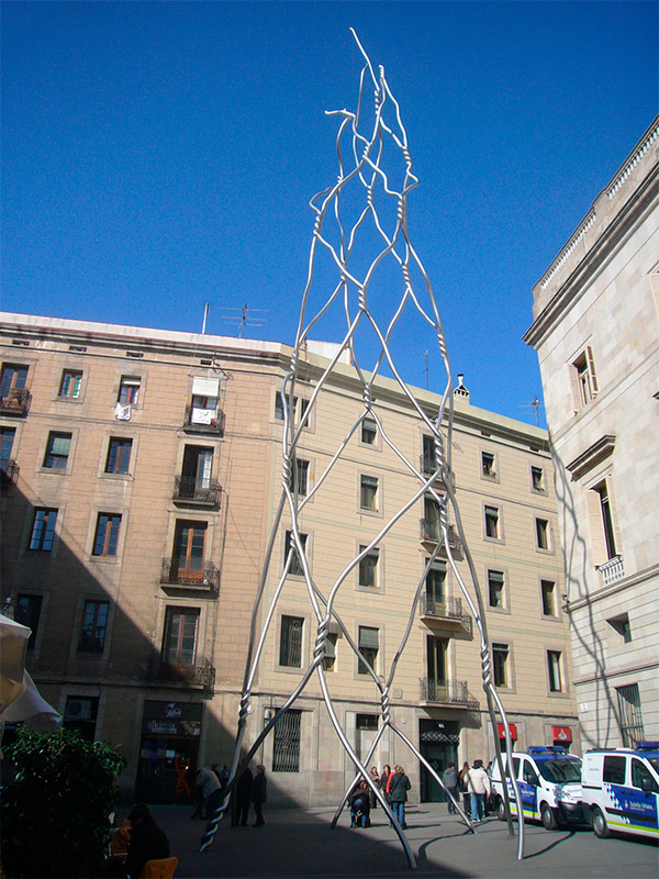 It is a conceptual construction in which Llena wanted to simulate a volcanic architecture that expressly avoids folklore. It represents the fragility of a castle from 12 steel tubes that should’ve been crowned with a crumpled aluminum plate, according to the first scale model. But this plate was suppressed in the final project, to reduce the weight of the structure and to avoid potential accidents due to fall in the future. The monument has also lowered the initially expected height from 30 meters to 27, so that it does not exceed that of the town hall building.
