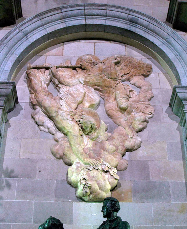 Nacido en Valencia en 1888, V. Navarro residió en Barcelona a partir de 1918. Fue nombrado catedrático de escultura en la Escuela de Bellas Artes de Sant Jordi en 1950, cargo que ocupó hasta 1958. Fue uno de los escultores oficiales del franquismo, llamado "la mano maestra" por su retrato de Franco, fuerza alabado por el dictador. Es el autor del relieve de alabastro con dos ángeles en una especie de nube que corona el monumento de la plaza Garriga i Bachs y marca un interesante contrapunto modernista al grupo austero de Josep Llimona, ya que el ritmo circular del relieve de Vicenç Navarro establece un diálogo con el grupo de hombres más tensos y dignas que van a la muerte con la esperanza del cielo que los dos ángeles parecen anunciar.