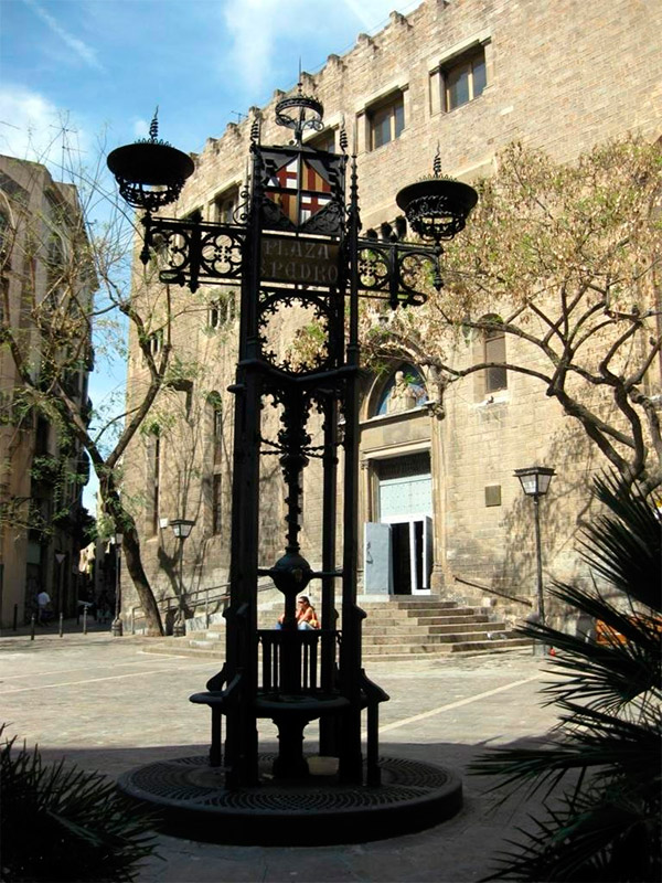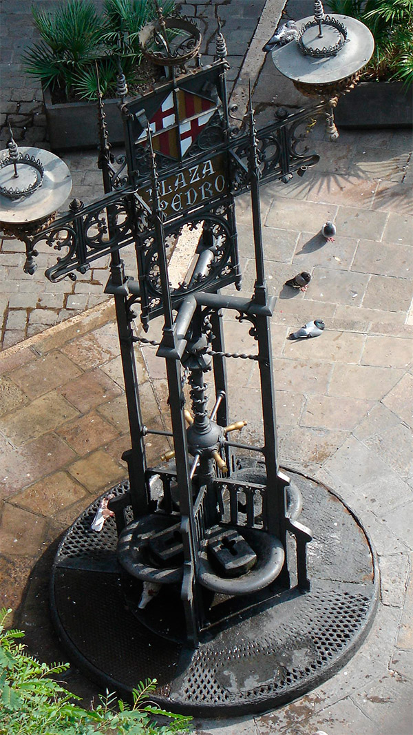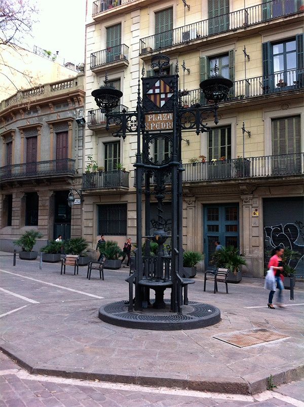 La llegada del agua de Moncada, en 1826, significó que se crearan seis fuentes públicas durante el reinado de Fernando VII, una de las cuales fue la de San Pedro, en la plaza situada frente al monasterio de San Pedro de las Puel·les. Aquella fuente de piedra fue sustituida por otra de estilo neogótico modernista, diseñada por el arquitecto Pere Falqués, en 1893. Se presupuestó en 4.879 pesetas, pero el coste final fue de 5.779. No se instaló hasta el 28 de octubre de 1895, pero como faltaba el gas que debía iluminar el farol que lo acompaña y se habían echado a perder unas adoquines, la aceptación municipal no se producir hasta el 28 de febrero de 1896. Un camión la dañó en 1997 y tuvo que ser restaurada.