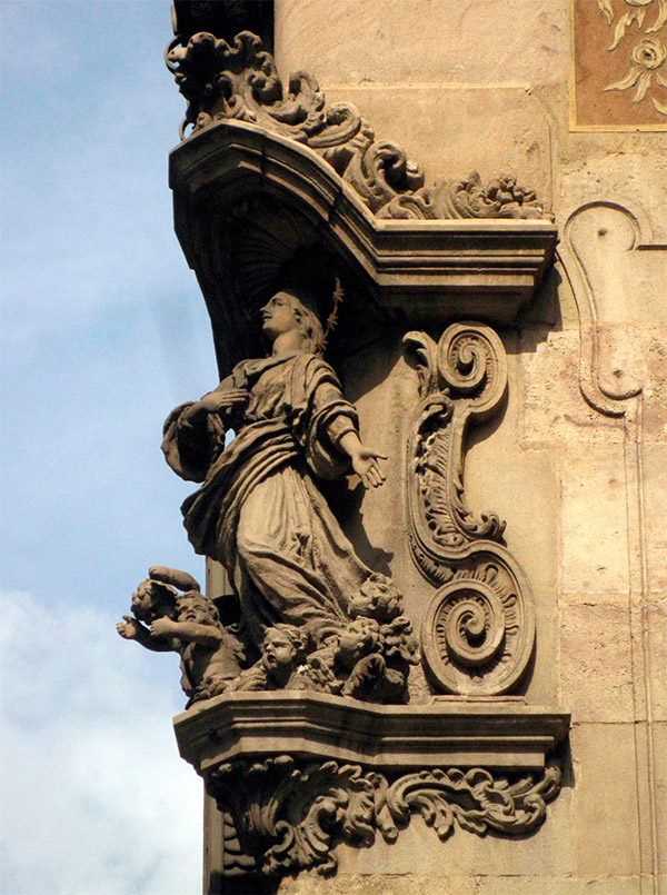 Las casas de los gremios solían tener una imagen bajo la advocación de la que sus socios se consideraban protegidos. Esta virgen era la que tenía cuidado de los tejedores de velos de seda y, por tanto, fue puesta una imagen, obra de Joan Enrich, en la esquina de la Casa de los Veleros, construida por Juan Garrido en 1763. La casa fue salvada al abrirse la Via Laietana y fue considerada monumento en 1919. Ha sido restaurada varias veces, la última en 2002.