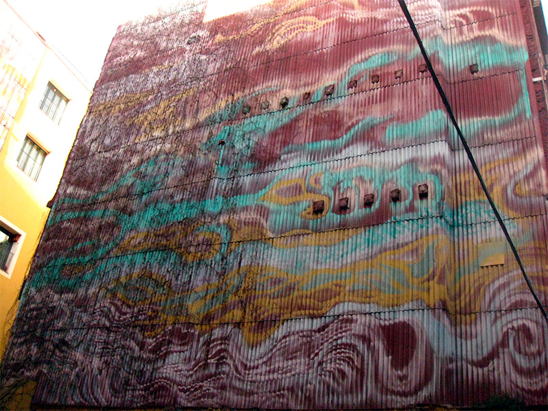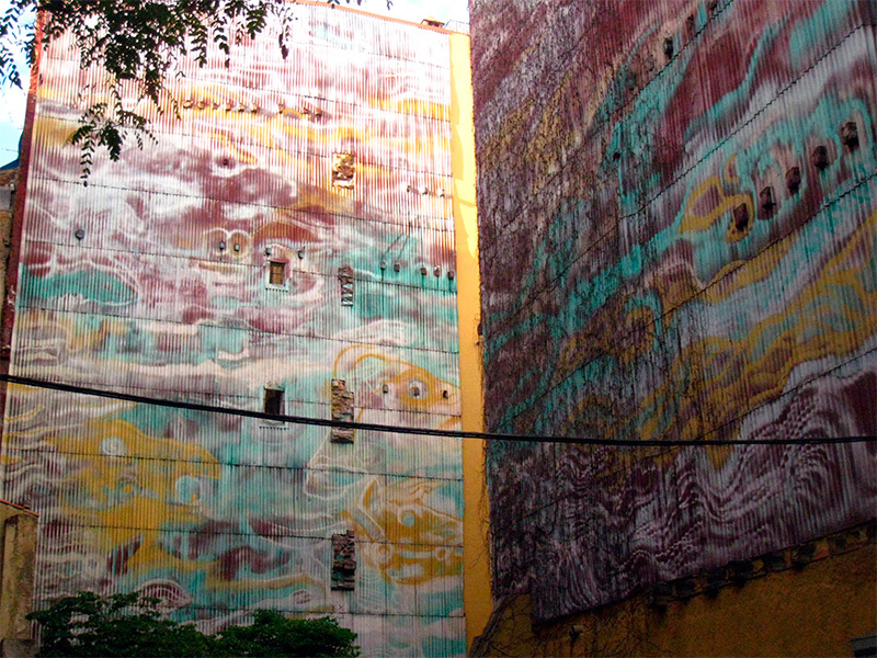Para la realización se contó con la ayuda de los bomberos, que prestaron las escaleras y otros artefactos. Si además sumamos que el fondo del mural se hizo rociando la pintura con compresores, podemos imaginar que fueron tres días de espectáculo aparatoso, casi como una fiesta en la calle. Viniendo desde el plano de Palau viviremos la sensación de ver dos paredes que se tocan y que se abren cuando avanzamos. El mural mismo es también como una visión irreal, una especie de espacio celeste donde nos parece que podemos distinguir formas en las nubes, la mayoría de ellas de animales que no guardan relación de escala; casi como un sueño o una alucinación de atmósfera densa, colores fluorescentes y formas inconexas que aparecen y se desvanecen en un mar de olas o fluidos extraño, incluyendo las ventanas, estas sí, de verdad.