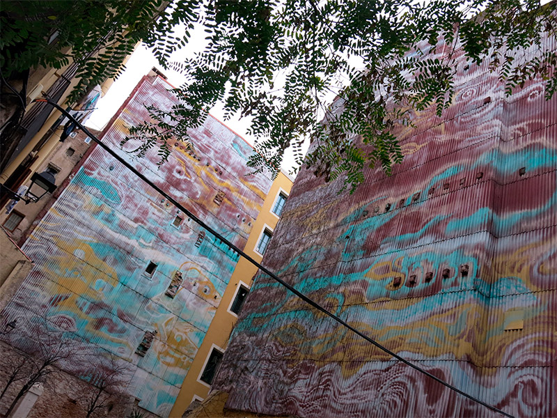 Buena parte de la reforma urbanística de Ciutat Vella ha consistido en esponjar calles y plazas, acción que se ha hecho básicamente derribando viejos edificios o dejando solares sin edificar. La plaza de las Ollas es una antiquísima plaza de Barcelona que ganó espacio justamente con este proceso. Los vecinos estaban muy contentos de la rehabilitación, pero les pareció que las dos medianeras que habían quedado a la vista no hacían justicia al conjunto y decidieron que los artistas podrían transformarlas. Desde la Plataforma de Entidades de la Ribera se inició un proyecto que llevó principalmente Luz Ventura, vecina y entonces consejera de Cultura en el distrito. Reunió a unos doce artistas del barrio, todos ellos con diferentes estilos y en diferentes momentos de su carrera, y coordinar las reuniones hasta encontrar un proyecto realmente colectivo. Cada artista trabajaría con su mano y por amor al arte, renunciaría a su estilo y poder identificar su firma en el muro. Poco a poco, se fueron perfilando las soluciones: formas ondulantes como el apoyo, predominio del color azul y creación de una especie de nebulosa o mar donde sutilmente emergieran unas formas que se pintarían individualmente.